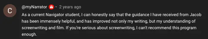 I know it can be scary to change your current trajectory, so I’m going to remove the risk from your plate. I’m fully confident in the Crucible Screenwriting System, and I know it will work for you because of the success my students have found. But I want you to be fully confident, too.